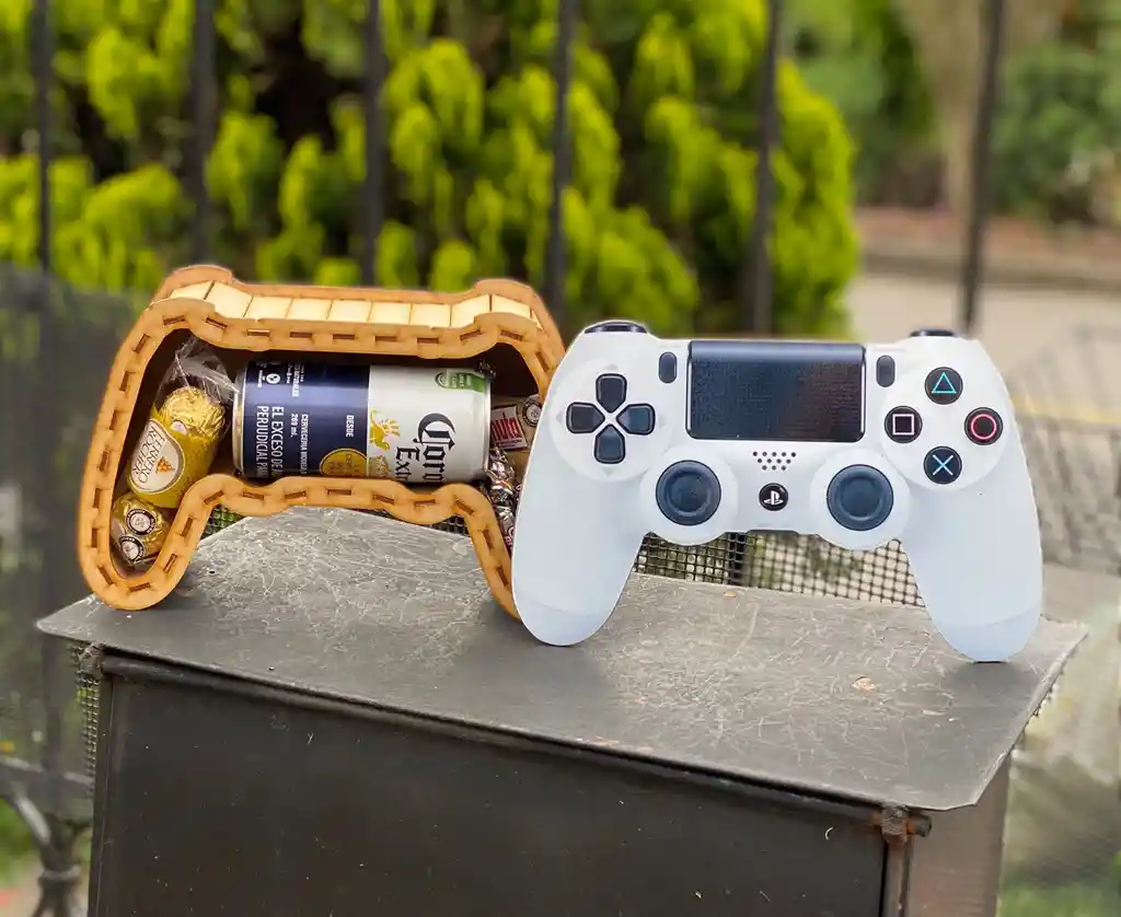 Incluye: caja Madera Play Station , Ferrero x 3, Cerveza corona, Hanuta y Choco Break