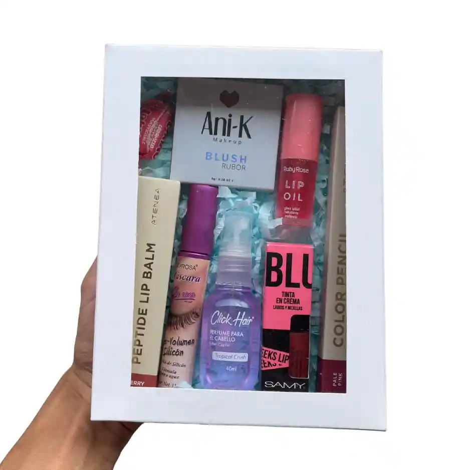 Esta caja contiene productos para labios, ojos, cabello, pestañas y mejillas