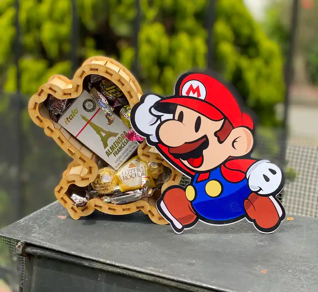 Incluye: Caja mario bros, ferrero x 3, Almendras, Jet burbuja y choco break