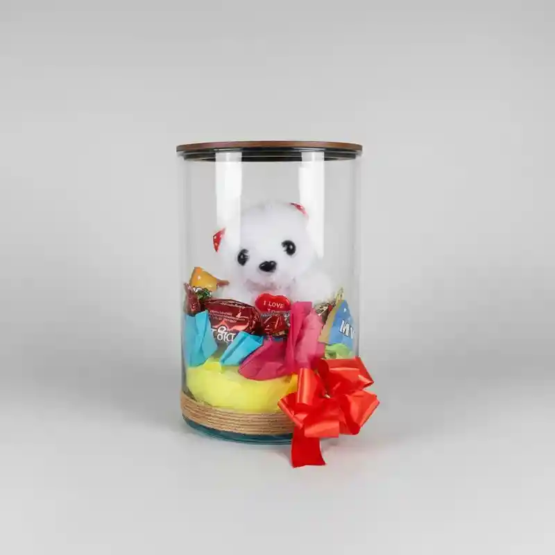 El regalo viene en frasco de vidrio y contiene - Un Osito Teddy con frase "te amo" - Variedad de dulces