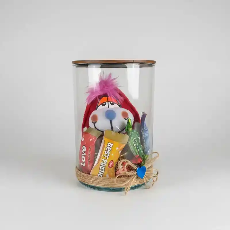 El regalo viene en frasco de vidrio y contiene - Un Perro de peluche con mensajes de amor - Variedad de dulces