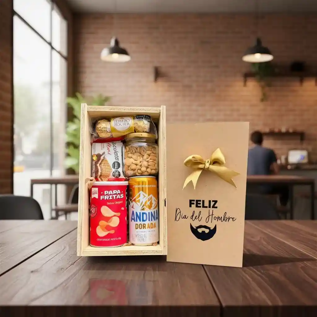 Incluye: caja Madera edicíon Dia del Hombre Cerveza Frasco mani Papas fritas Galleta de avellana Ferrero x 3
