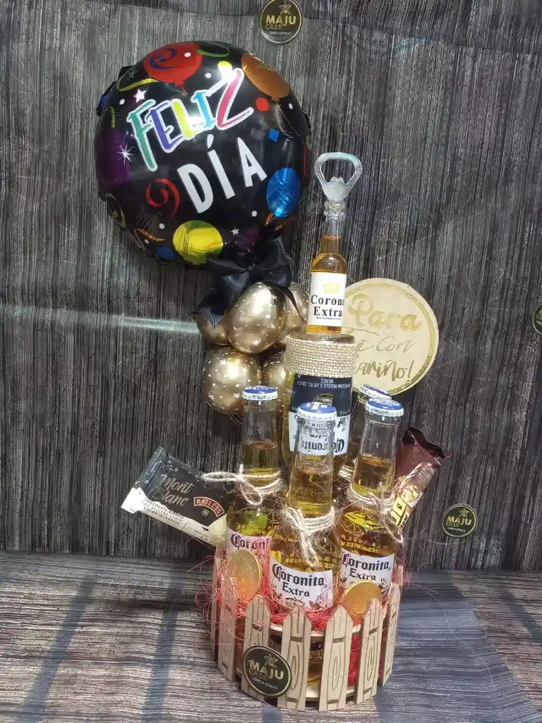 ancheta de cervezas corona mas destapador,monedasde chocolate ,chocolatinas grandes y arreglo de globos