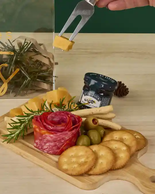 MALETÍN CRISTAL · Felices Fiestas ✨ Un hermoso maletín acrílico personalizado con “Felices Fiestas”, decorado con un lazo navideño y etiqueta en la manija. Un regalo elegante, moderno y lleno de sabor para celebrar la Navidad con estilo. Incluye: Tabla de madurados con cubiertos, Rosa de salami, Chorizo vela, Queso en cuadritos Palitroques en finas hierbas, Galletas Ritz, Romero fresco Mermelada St. Dalfour, Vino Santa Rita 120 · Reserva Especial (375 ml), Café premium Juan Valdez, Decoración navideña con piñas, bolitas y guirnalda, Maletín acrílico con moño y tarjeta