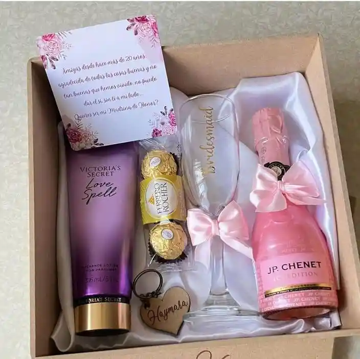 caja decorada champaña j.p chocolates ferrero copa personalizada crema o loción de victoria secret globo según la ocasión tarjeta personalizada