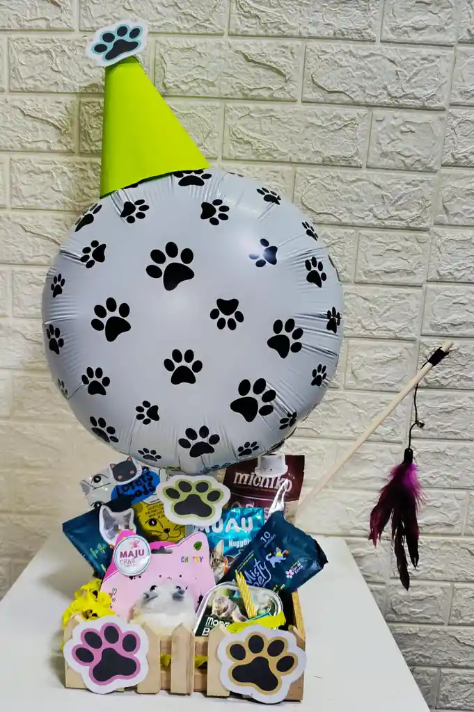 Regalo para gato -Globo con Gorro de fiesta festivo con detalle de huella. - Cesta de madera artesanal y reutilizable. - Selección premium de snacks - Torta húmeda para gatos. con velita. - Juguetes variados: peluche suave ratoncito impulsado con cuerda y varita con plumas. -galleticas -Pañitos para su limpieza - Decoración temática con huellas de patitas. - Perfecto para cumpleaños, aniversarios o como un mimado especial, para bienvenida al hogar