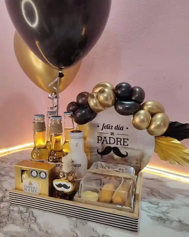 Regala amor hoy con esta hermosa sorpresa, contiene: Mesa o base de madera decorada con arco en globos, globos medianos, letrero según la ocasión, bebida, frutos secos, cervezas, bandeja de fritos o postre, chocolates y una tarjeta personalizada muy especial. Envíanos el mensaje que quieres dedicar para hacer este hermoso regalo realidad.