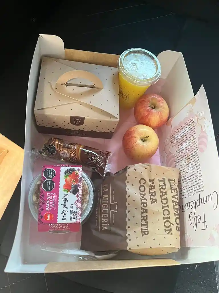 caja decorada según la ocasión pastel de la migueria: (pollo, carne, 3 quesos, o el que desee) jugo de naranja o milo postre chocolates furta entera porfrait tarjeta dedicatoria