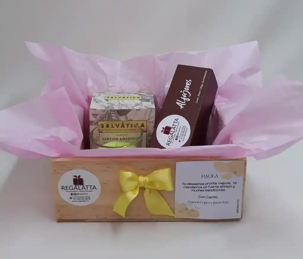 5 deliciosos Alfajores acompañados de infusiones aromáticas del Amazonas y vela en envase de vidrio, presentados en una sobria caja de madera con cinta y tarjeta. Un regalo para cualquier ocasión
