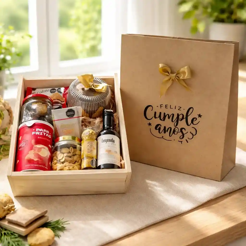 Incluye: vINO 187 ML Torta personal Biscolata Frasco maní Ferrero x 3 Frasco chocolates Almendras Pringles