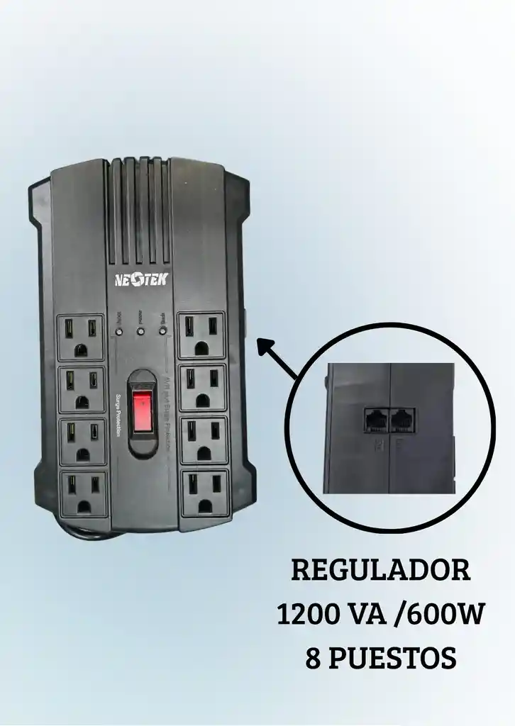 Especificaciones ENTRADA: Voltaje normal: 120Vca Rango de voltaje de entrada: -18%, +16% Frecuencia: 60Hz SALIDA: Rango de voltaje de salida: -10%, +10% Cantidad de salidas: 4 tomas protegidas con supresor de picos 4 tomas reguladas PROTECCIÓN Sobrecarga: Botón para ajustar el circuito Temperatura de corte: Termofusible de protección Sobretensión: 175 Joules Protección para linea de teléfono: RJ-11 port INDICADOR LED: LED de encendido : Verde LED de voltaje bajo (Boost) / alto (Buck): Amarillo AMBIENTE: Temperatura de operación : 0~40 ℃ : 32~104 °F Nivel de ruido: 40dB Humedad relativa: 95% (No condensada)