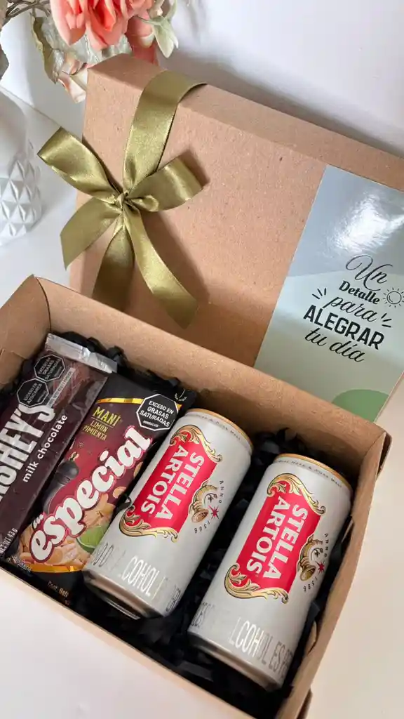 El regalo perfecto para desconectar y disfrutar de un momento de placer bien merecido. Nuestro Kit Relax & Snacks es una selección de sabores clásicos y la bebida ideal para hacer cualquier tarde memorable. Contiene: Dos Cervezas Stella Artois, Chocolate Hershey's Milk Chocolate, Maní Especial (Limón y Pimienta). Incluye tarjeta y bolsa de empaque. Si deseas personalizar tu regalo antes de comprar te recomendamos comunicarte al WhatsApp 3102078219 para ultimar detalles. Para que tu regalo llegue con la tarjeta perfecta y el mensaje ideal, te agradeceríamos especificar el motivo de su obsequio al realizar su pedido (cumpleaños, aniversario, amor, graduación, etc.). ¡Así podremos hacer su detalle aún más especial! 💖