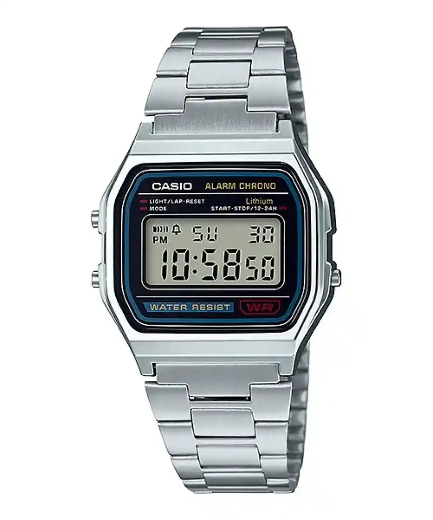 Características y especificaciones. -Formato de visualización Digital -Tipo de movimiento Cuarzo -Tipo de fuente de energía Batería -Tipo de cierre Hebilla -Tipo de tirante Pulsera -Tipo de deporte Natación -Tipo de cierre Cierre plegable -Nivel de resistencia al agua -Resistente al agua -Función de embellecimiento Cristal -Materiales y cuidado -Material de la correa Acero inoxidable -Material de la caja Plástico Tipo de cristal Acrílico Estilo -Nombre de estilo A-158WA-1 -Forma Octagonal -Color de la correa Plata -Color de la esfera Negro -Estilo del frente Digital Medidas -Diámetro de la caja 33 -Milímetros -Ancho de la correa 31 -Milímetros -Grosor de la caja 17 Milímetros