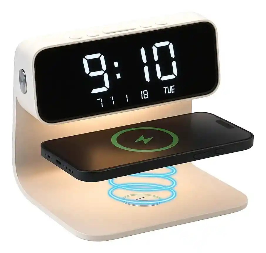 Reloj decorativo despertador con carga inalámbrica para celulares Receptor carga inalámbrica reloj digital de mesa Descripción del producto Descubre el Reloj de Mesa Inteligente, el complemento perfecto para tu hogar. Este moderno reloj no solo muestra la hora, sino que también integra funciones avanzadas como carga inalámbrica, proyector de luz suave y termómetro. Con su diseño elegante y minimalista, se adapta a cualquier ambiente, brindando estilo y funcionalidad. Mejora tu rutina diaria con un solo vistazo. Características del producto Pantalla LED de alta visibilidad. Función de carga inalámbrica para smartphones. Luz nocturna ajustable. Control táctil para una experiencia intuitiva. Especificaciones técnicas Dimensiones: 20 cm x 10 cm x 8 cm. Material: Plástico ABS de alta calidad. Peso: 500 gramos. Alimentación: Conector USB. Certificación: CE y ROHS. Accesorios del producto Cable de carga USB. Manual de usuario.