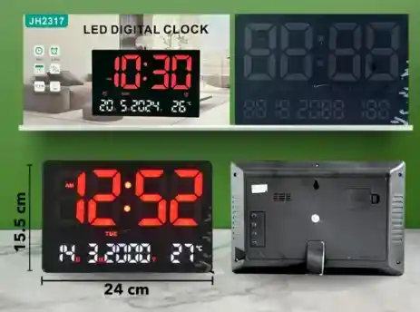 ¡Todo lo que necesitas, a simple vista! Funcionalidad, diseño moderno y excelente visibilidad. • Pantalla LED grande de 24 x 15.5 cm: fácil de leer desde cualquier ángulo. • Muestra hora (AM/PM), día, fecha y temperatura. • Función de alarma con indicador de encendido. • Diseño elegante para escritorio o pared. • Botones laterales para configuración rápida y precisa. • Ideal para el hogar, oficina, locales comerciales o estudios. • Alimentación por cable (incluido) • Empaque con diseño decorativo.
