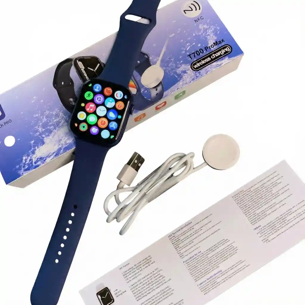 El T700 Pro combina diseño moderno, gran rendimiento y funciones inteligentes que se adaptan a tu estilo de vida. Un reloj pensado para quienes buscan estar conectados y cuidar su bienestar en todo momento. Características destacadas: Pantalla HD de gran tamaño con excelente definición y respuesta táctil. Monitoreo de salud: frecuencia cardíaca, presión arterial, oxígeno en sangre y calidad del sueño. Múltiples modos deportivos para registrar tu actividad física. Notificaciones en tiempo real de llamadas, mensajes, WhatsApp, Facebook y más. Batería de larga duración con carga magnética. Resistente a salpicaduras y sudor. Disponible en varios colores de correa: azul marino, verde, rojo, rosa, blanco y negro. Compatible con Android y iOS vía conexión Bluetooth. El T700 Pro no es solo un reloj, es tu compañero diario para mantenerte activo, saludable y siempre conectado, con un diseño elegante que combina con cualquier estilo. Modelo: T700 Pro Pantalla: IPS HD de 1.75" / Resolución 320x385 px Conexión: Bluetooth 5.0 Compatibilidad: Android 5.0 / iOS 9.0 o superior Funciones de salud: -Monitor de frecuencia cardíaca -Medición de presión arterial -Saturación de oxígeno (SpO2) -Monitor de sueño Funciones inteligentes: -Notificaciones de llamadas, SMS y apps (WhatsApp, Facebook, Instagram, etc.) -Control remoto de música y cámara -Recordatorio de sedentarismo -Podómetro, calorías, distancia -Modos deportivos: Correr, caminar, ciclismo, entre otros Resistencia: IP67 (resistente a salpicaduras, no sumergible) Batería: 200-230 mAh (duración aproximada de 2 a 5 días según uso) Carga: Magnética (incluye cable) Material de correa: Silicona ajustable Colores de la correa: azul marino Dimensiones del reloj: 44 mm