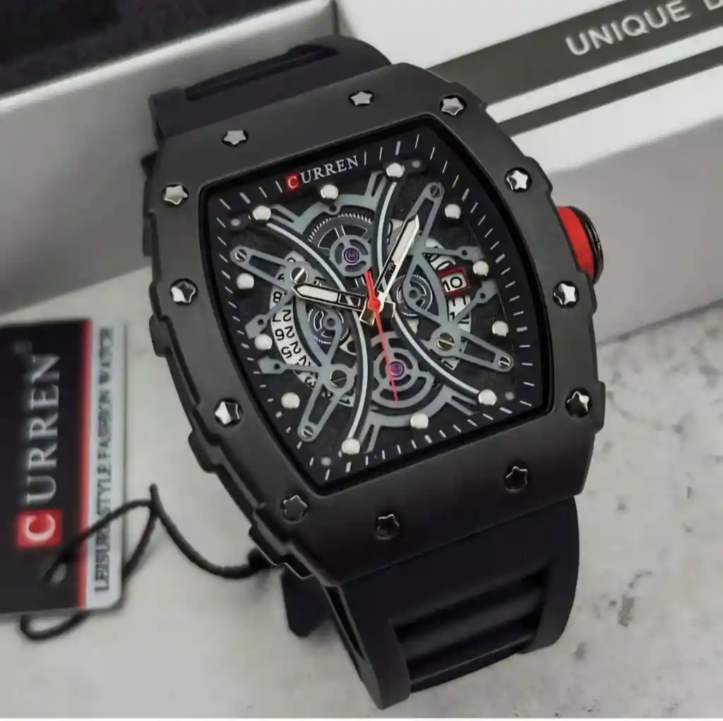 Reloj Curren Original es un reloj de cuarzo para hombre con un diseño deportivo y de negocios, que combina lujo y practicidad. Marca y Modelo: Curren 8438. Estilo: Moda, casual y deportivo. Movimiento: Cuarzo preciso. Materiales: Caja: Aleación o acero inoxidable. Correa: Silicona, duradera y cómoda. Cristal: Vidrio mineral de alta dureza. Características: Esfera semihueca (esqueleto). Función de fecha automática/calendario. Manecillas luminosas para facilitar la lectura en condiciones de poca luz. Resistencia al agua: 3 ATM (30 metros), adecuado para salpicaduras, pero no para nadar o ducharse. Dimensiones aproximadas: Diámetro de la caja: 43 mm. Longitud de la correa: 24 cm. Cierre: Tipo hebilla. El reloj utiliza tecnología de revestimiento IP para un color duradero que no se desvanece con el tiempo. Es un accesorio versátil que se adapta a diversas ocasiones.