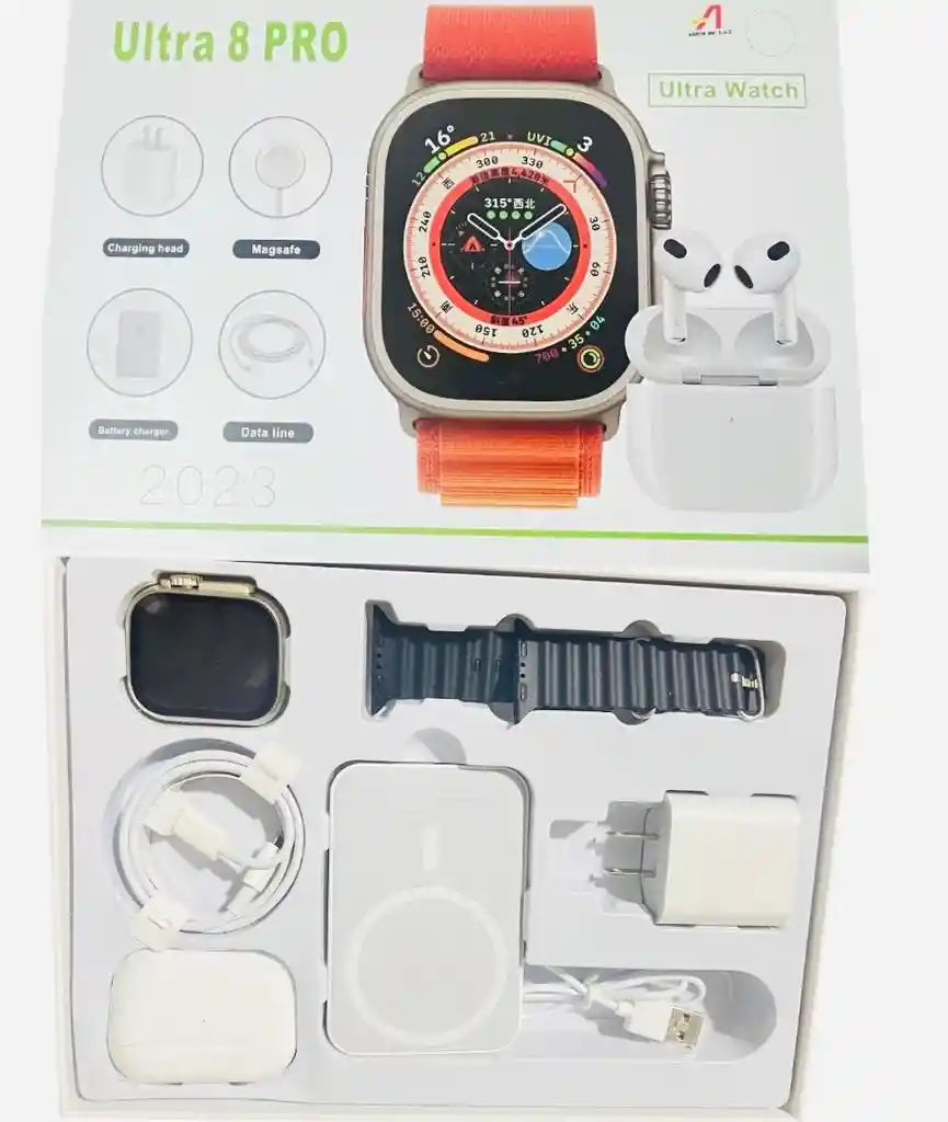 Reloj Smart Watch Ultra 8 PRO con banda negra + cargadores + power bank + auriculares Monitor de ritmo cardíaco Conteo de pasos Monitoreo de sueño Notificaciones inteligentes Conectividad Bluetooth y GPS Compatible con Android y iOS Conexión WiFi Incluye 7 correas intercambiables Tipo de pantalla: Alta visibilidad