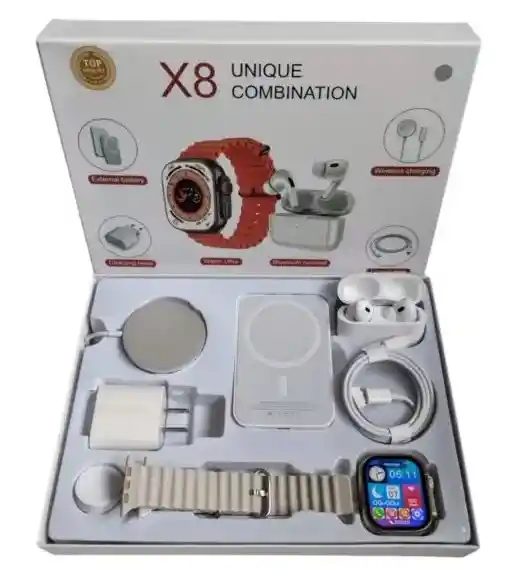 Reloj Smart Watch X8 Unique Combination con banda gris + cargadores magnetico y convencional + power bank + auriculares Perilla funcional para hacer zoom y cambiar los fondos Giroscopio puedes encender la pantalla del reloj moviendo la muñeca Desde el Smartwatch puedes hacer y recibir llamadasde tu celular por medio de conexión bluetooth (Similar a conectar unos audífonos Bluetooth) el Reloj Tiene micrófono y altavoz incorporado Notifica los mensajes de las redes sociales (Facebook, WhatsApp, Instagram, Gmail, etc.) puedes ver y leer los mensajes de todas las aplicaciones de tu celular desde el SmartWatch sin necesidad de sacar tu celular. Gracias a su pantalla de 154 pulgadas, se aprovecha mejor el espacio La pantalla es Resistente al agua principalmente para lluvias o salpicaduras (No es Sumergible) Desde tu celular puedes ponerle una imagen de fondo pantalla como una foto tuya o de tu mascota Asistente de voz, te permite interactuar con el reloj mediante comandos de voz, sin necesidad de usar tus manos para controlarlo. Puedes usarlo para realizar diversas acciones en el reloj y en tu teléfono inteligente vinculado, como hacer llamadas telefónicas, buscar información en la web, reproducir música, entre otras.