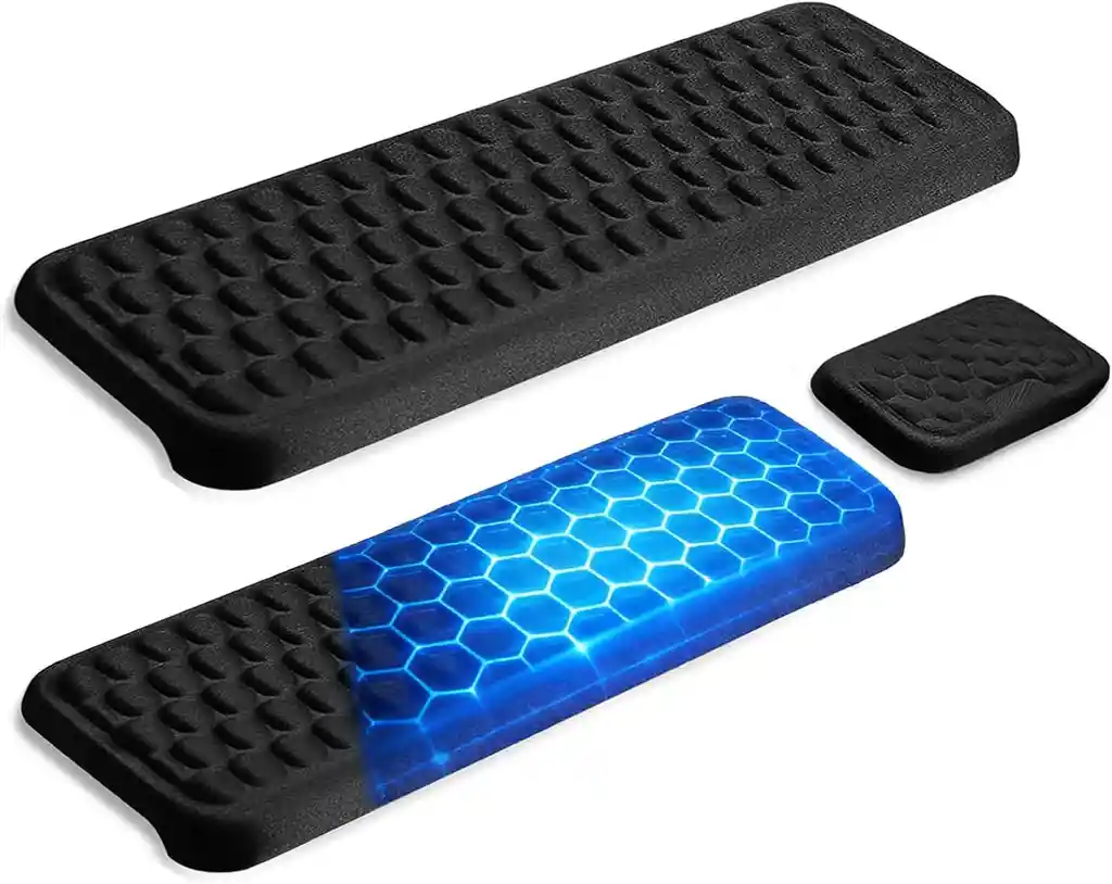 AL0000002134 MATERIALES PREMIUM Y CONFORT SUPERIOR El reposamuñecas presenta un elegante patrón de diamante que ofrece una sensación suave y visualmente atractiva. Incorpora espuma viscoelástica de alta calidad con rebote lento de 5 segundos para un soporte cómodo y duradero. Su recubrimiento de tela de licra sedosa proporciona una experiencia similar a apoyar la muñeca sobre una nube. SUPERFICIE TRANSPIRABLE CON EFECTO MASAJE La superficie de tela transpirable integra nódulos de micromasaje que mejoran la circulación del aire, mantienen la piel seca y brindan un suave efecto tipo acupresión. Ayuda a estimular la circulación sanguínea y a reducir la tensión durante largas jornadas de uso. DISEÑO ERGONÓMICO EN FORMA DE L Este set de reposamuñecas para teclado y mouse incluye una almohadilla para teclado de 11.8 x 3.9 x 0.9 pulgadas y una almohadilla para mouse de 5.9 x 3.1 x 0.8 pulgadas. Su diseño en forma de L se adapta al borde del escritorio, ofreciendo soporte para muñeca, brazo y codo, reduciendo la fatiga por uso prolongado. Ideal para oficina, hogar o espacios de juego. BASE ADHESIVA DESMONTABLE Y SEGURA Incluye cuatro almohadillas adhesivas que proporcionan máxima estabilidad durante el uso. Se pueden retirar fácilmente sin dejar residuos ni dañar la superficie del escritorio, permitiendo una instalación flexible con o sin adhesivo. FÁCIL DE LIMPIAR Y SET DURADERO DE 3 PIEZAS El conjunto incluye dos reposamuñecas para teclado y un reposamuñecas para mouse. Fabricados con tela resistente a las manchas, son fáciles de limpiar y altamente duraderos, ideales para trabajo, gaming o viajes.