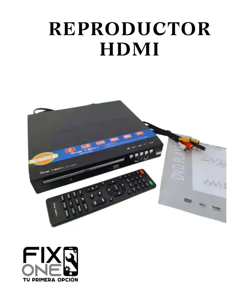 REPRODUCTOR DVD MULTIFORMATOS USB ONE TECH Lector DVD, CD, MP3 Puerto USB 1. DVD ONE TECH 1. Cable Audio y Video 1. Manual de Usuario 1. Control Remoto Soporta Estandar MPEG4, Reproductor de Video Digital Compatible con DVD, VCD, MP3, CD, Con conector USB Funciones de karaoke Conexion de audio 2.1CH estereo ✅Nuestros productos antes de ser enviados son probados ✅Imagen de referencia