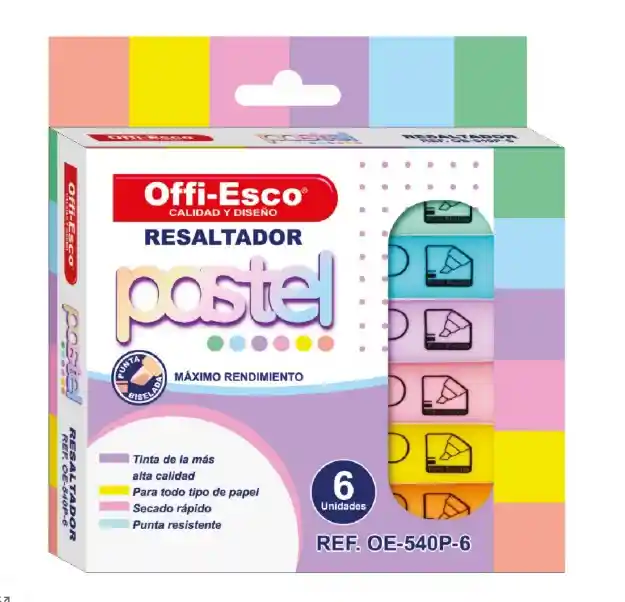 🖍️✨ Resaltador Grande Pasteles Offi-Esco x6 Unidades 🌈📚 Dale color a tus apuntes y documentos con estos resaltadores en tonos pasteles 💜💛💚. Su punta biselada permite subrayar, remarcar y escribir con suavidad 📝👌. Perfectos para oficina, colegio o uso personal 🎒🏢. ⭐ Características: ✅ Presentación: paquete x6 unidades 📦 ✅ Colores pasteles suaves 🌸🌼 ✅ Punta biselada para trazos finos y gruesos ✍️ ✅ Tinta duradera y de secado rápido 🕒 ✅ Ideal para estudio, trabajo y manualidades 📖✨
