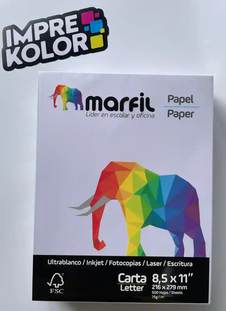 ¡Papel de alta blancura para impresiones y copias impecables! 📄✨ En IMPREKOLOR SAS te traemos la resma Marfil, la preferida en entornos escolares y de oficina por su calidad superior y blancura extrema. Especificaciones Técnicas: Contenido: 1 Resma de 500 hojas bond. Gramaje: 75g/m² ideal para evitar atascos en la impresora. Compatibilidad: Perfecta para Inkjet, Láser, fotocopias y escritura manual. Certificación: Producto con sello FSC, apoyando el manejo forestal responsable. ⚡ ¡PÍDELO YA!: Recibe tu resma en minutos y olvídate de las interrupciones en tus trabajos o impresiones. ¡Calidad garantizada por Imprekolor! 📲 315 388 0960