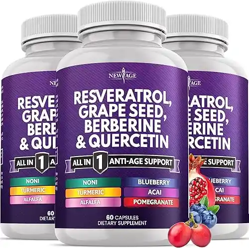 NEW AGE Resveratrol, berberina, extracto de semilla de uva, quercetina, suplemento de polifenol para mujeres y hombres con extracto de noni