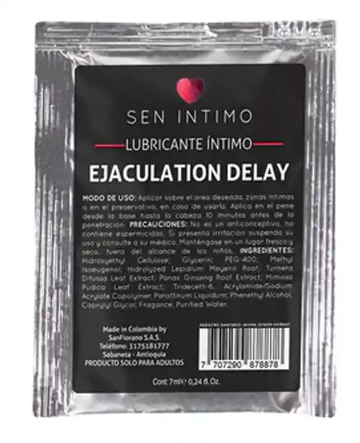 RETARDANTE INTIMO - EJACULATION DELAY - 7ml CON REGISTRO INVIMA Fórmula de máxima potencia para prolongar el placer sexual. Modo de uso: Aplica en el pene desde la base hasta la cabeza 10 minutos antes de la penetración. Confidencialidad: Tus pedidos se envían en una caja o sobre totalmente sellado y opaco sin ningún tipo de marcas externas. Para nosotros es muy importante tu privacidad.