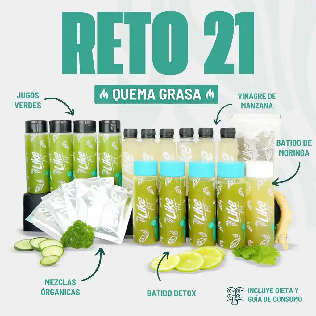Baja de peso con nuestro RETO 21. ¡Llego el momento de cuidarte de tí! Pierde hasta 5 KILOS GARANTIZADOS. Nuestro RETOS se compone por jugos verdes, colágeno, desinflamatorios 100% naturales. Perfecto para desintoxicar tu cuerpo y mejorar tu digestión. Amate, cuida tu salud y bienestar uniéndote al RETO 21. CONTENIDO 4 Jugos Verdes 250ml 4 Batidos DETOX 250ml 6 Shots Vinagre de Manzana 120ml 1 Batido de Moringa 250ml 3 Colágeno Hidrolizado Sachet 10g 3 Mezcla de Aceleración Metabólica Sachet 3g Guía de consumo y recomendaciones. INGREDIENTES Apio Pepino Limón Cidra Perejil Jengibre Moringa Vinagre de Manzana Colágeno Hidrolizado Canela en polvo Semillas de chía. INCLUYE 2 OBSEQUIOS 1 Semillas de chía 30g Dieta desarrollada por expertos BENEFICIOS Quema Grasa corporal Mejora la Digestión Acelera el Metabolismo Controla la ansiedad Nivela el azúcar en la sangre Brinda altos niveles de energía