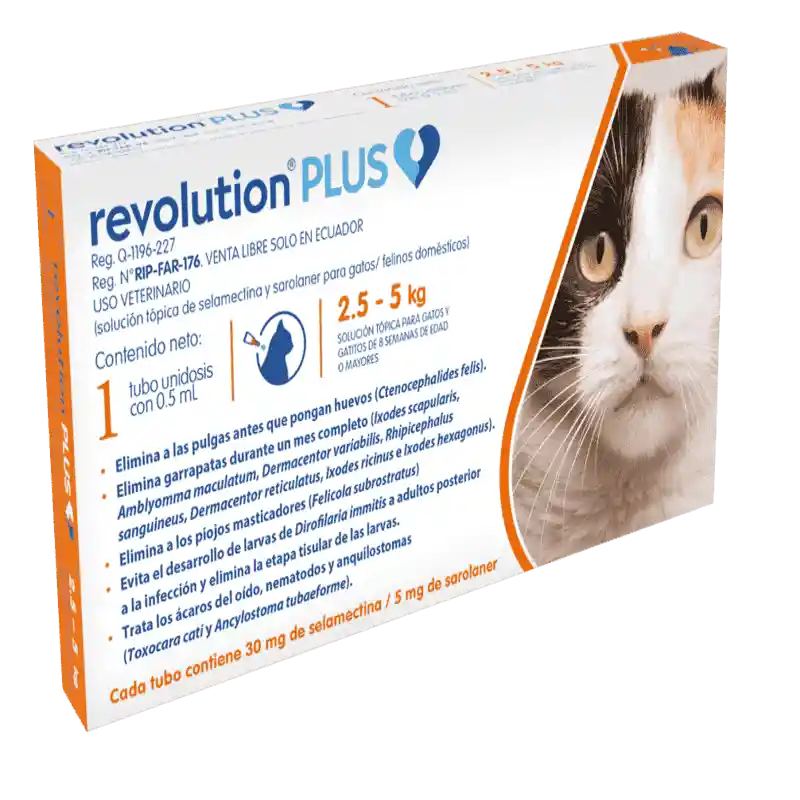 Revolution Plus es un desparasitante seguro para gatos y gatitos a partir de las 8 semanas de edad y con un peso entre 2,5 Kg hasta 5 Kg. Ofrece una protección de amplio espectro, de aplicación mensual que es fácil de usar, con rápido secado y pequeño volumen, que ofrece una protección 7 en 1 contra parásitos internos y externos. Gracias a la acción combinada de Selamectina y Sarolaner actúa contra pulgas, garrapatas, piojo masticador, ácaros del oído, nemátodos gastrointestinales y gusano del corazón por un mes completo. Tamaño de la mascota: Mediano. Etapa de la vida: Todas las Edades.