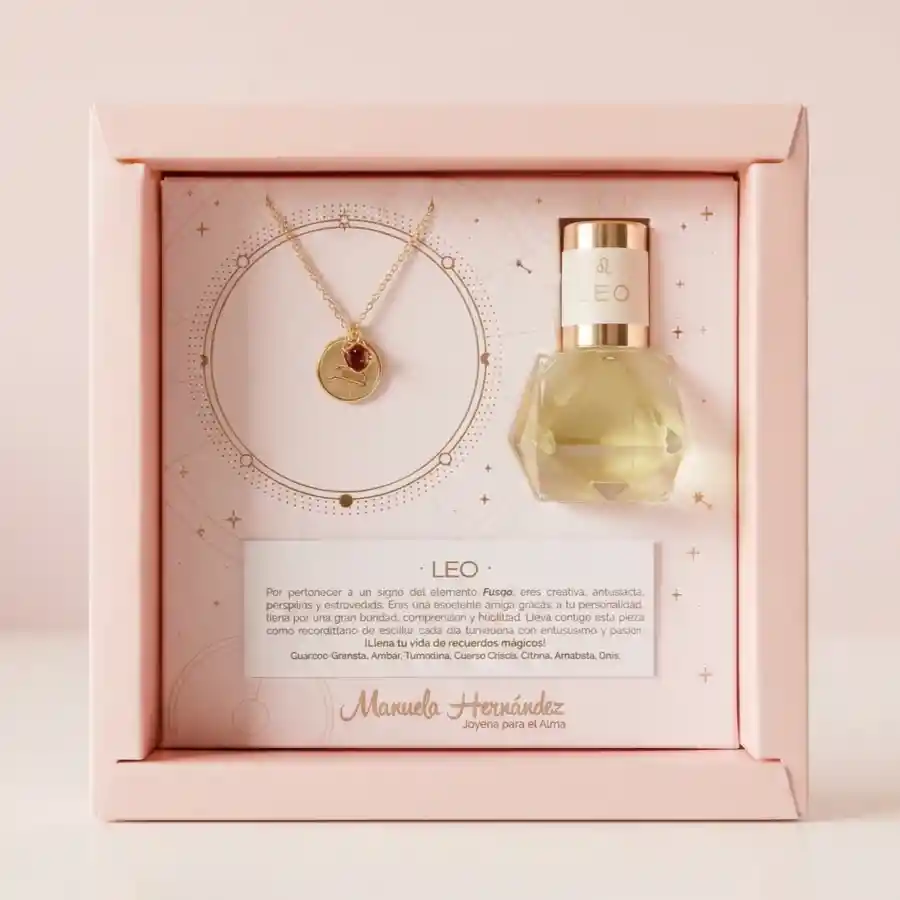 Ritual Zodiacal Leo 🌙✨ Un tesoro con significado para conectar con tu energía o regalar: cadena bañada en oro 18K con la constelación de tu signo, cuarzo natural alineado a tu zodiaco y blend de aceites esenciales para intencionar, armonizar y atraer lo que deseas. 💫 ¿Qué trae tu Ritual? -Cadena bañada en oro 18K con dije de la constelación de tu signo zodiacal acompañado de un cuarzo natural que vibra con la energía de cada signo. Longitud de la Cadena: 45cm -Blend de aceites esenciales inspirado en tu zodiaco, para aromatizar, intencionar y llevar contigo siempre. (10ml)