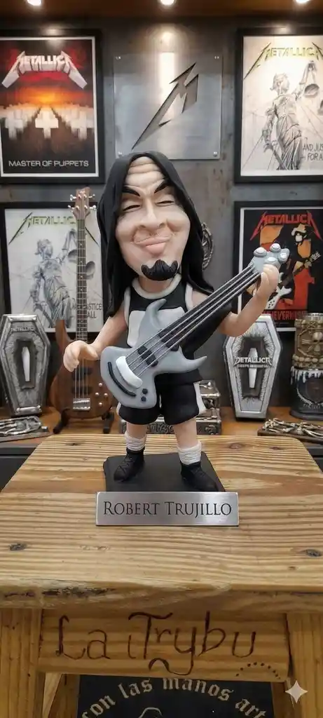 ¡Lleva la energía del escenario a tu casa! 🤘 Colección exclusiva de figuras tipo caricatura de los integrantes de Metallica. Cada pieza es una obra de arte única, esculpida y pintada totalmente a mano. ●Personajes disponibles: Robert Trujillo. ●Material: Alta calidad con acabados detallados en instrumentos y vestimenta. ●Ideal para: Coleccionistas, fans del metal y decoración de espacios con estilo rockero.