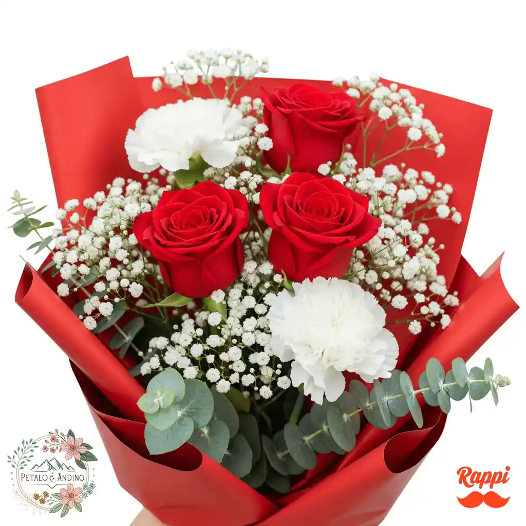 3 rosas rojas 2 claveles blancos 3 ramitas de gipsófila blanca 1 rama de eucalipto