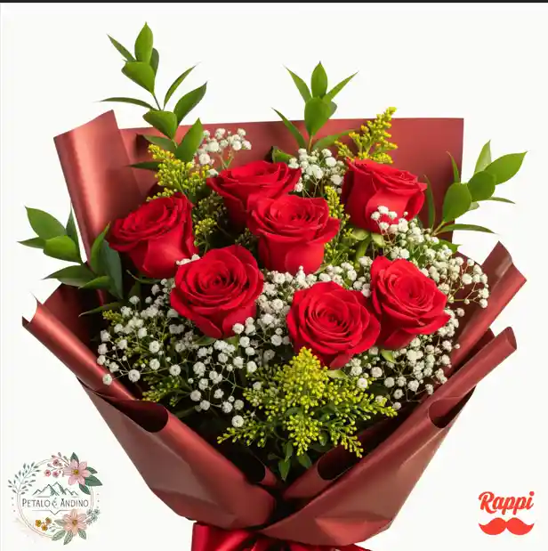 7 rosas rojas 5 ramitas de gipsófila blanca 3 ramitas de solidago 4 ramitas de rusco verde