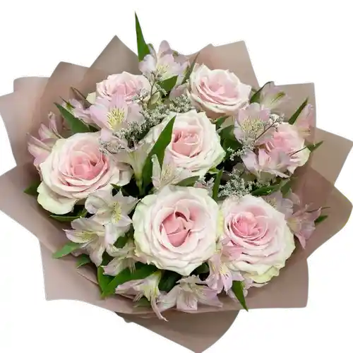 Un bouquet elegante de rosas rosadas y flores delicadas en tonos suaves, perfecto para expresar amor con sutileza y estilo. Flores frescas de calidad premium, seleccionadas y armadas profesionalmente para un diseño armonioso y sofisticado. Algunas flores pueden variar según la disponibilidad de temporada, manteniendo siempre la estética y el valor del arreglo. Incluye tarjeta personalizada sin costo adicional.