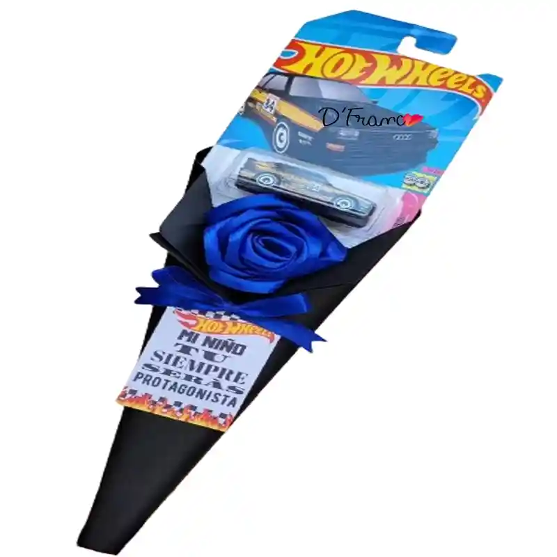 Hermosa rosa eterna azul hecha en cinta de tela en tendencia, con un carrito hot wheels, un regalo que durará para siempre es perfecto para todas tus ocasiones!