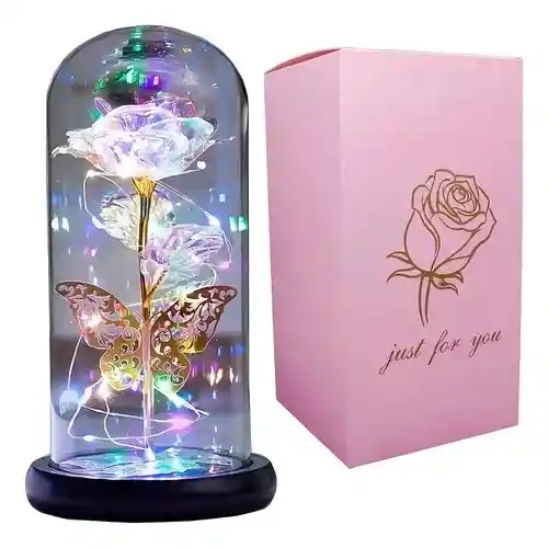 Rosa Flor Eterna Preservada Con Luz Led Domo Petalos (pilas No Incluidas)