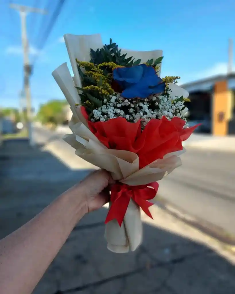 Rosa individual azul con gipsophilia y follaje