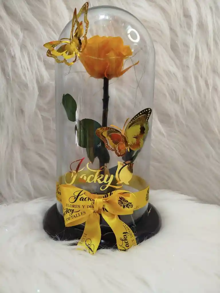 Rosa preservada, duración aproximada de 4 años, se entrega con cúpula de vidrio, luces led cálida, envuelta en papel tornasol y tarjeta personalizada. *Variedad de colores disponibles*
