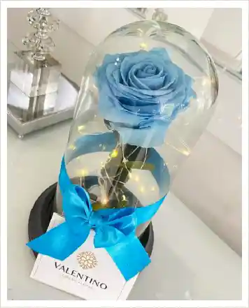Es una rosa azul premium que puede durar aproximadamente 5 años. En urna de cristal iluminada.