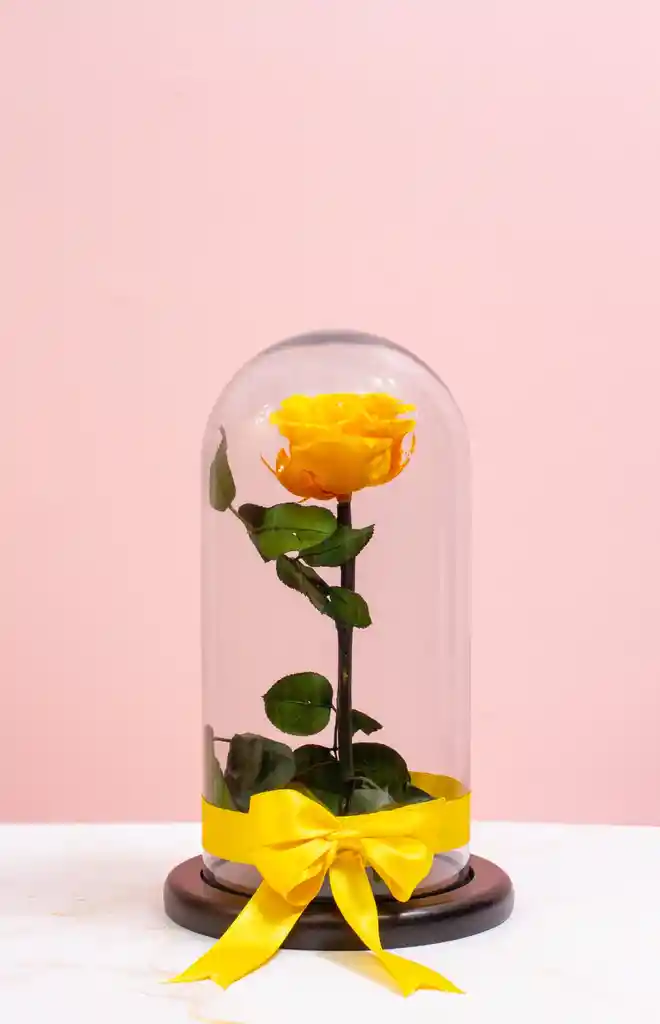Imagina una rosa preservada en un vibrante color amarillo. Su tono es intenso y llamativo, capturando la mirada con su belleza singular. Los pétalos suaves y delicados parecen congelados en el tiempo, conservando toda su frescura y forma natural. La rosa está inmersa en un estado de eterna gracia, emanando una sensación de elegancia y sofisticación. Su color resalta en cualquier entorno, añadiendo un toque de alegría y encanto a cualquier espacio donde se encuentre. Esta rosa preservada tiene un tiempo de durabilidad de 4 a 5 años, despues de este tiempo sus petalos se empezaran a caer de manera natural.
