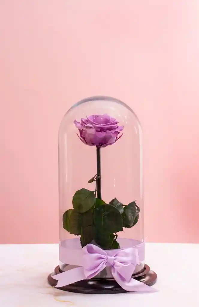 Imagina una rosa preservada en un vibrante color morado. Su tono es intenso y llamativo, capturando la mirada con su belleza singular. Los pétalos suaves y delicados parecen congelados en el tiempo, conservando toda su frescura y forma natural. La rosa está inmersa en un estado de eterna gracia, emanando una sensación de elegancia y sofisticación. Su color resalta en cualquier entorno, añadiendo un toque de alegría y encanto a cualquier espacio donde se encuentre. Esta rosa preservada tiene un tiempo de durabilidad de 4 a 5 años, despues de este tiempo sus petalos se empezaran a caer de manera natural.