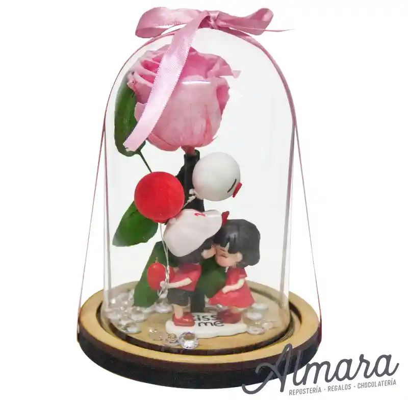Rosa preservada mediana con figura novios o viejitos en banca Empaque urna base de madera Bolsa tipo ancheta con moño
