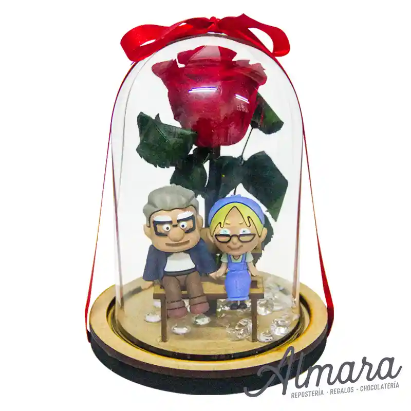 Rosa preservada mediana con figura de viejitos en banca Empaque urna base de madera Bolsa tipo ancheta con moño