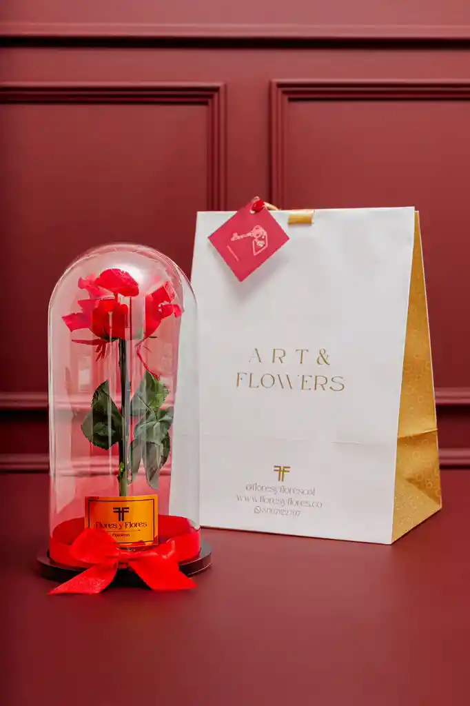 Hermosa rosa preservada premium roja en urna de cristal y base de madera, edición san valentin con una duración de más dos años, acompañado de bolsa de lujo, tarjeta personalizada y cuidados de la rosa.