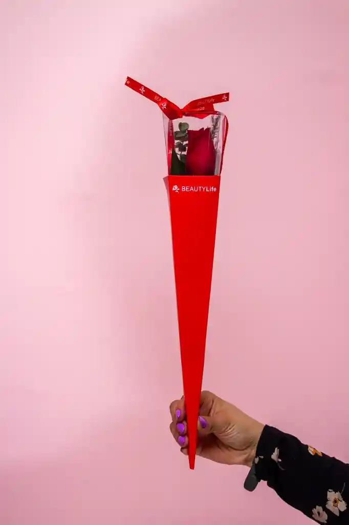Esta es una única rosa natural, presentada de manera estilizada e individual dentro de un empaque largo con forma de cono, lo que proyecta una imagen de pasión y elegancia. La rosa exhibe un intenso y clásico color rojo oscuro o carmesí, y está complementada por un pequeño acento de follaje verde en la base del capullo. El empaque se distingue por su base de cartulina de color rojo vibrante, que complementa el color de la rosa, y una cubierta superior de plástico transparente que protege la flor. El arreglo se completa con una pequeña cinta roja con texto repetido atada en la parte superior, luciendo poderoso y romántico gracias al uso dominante del color rojo.