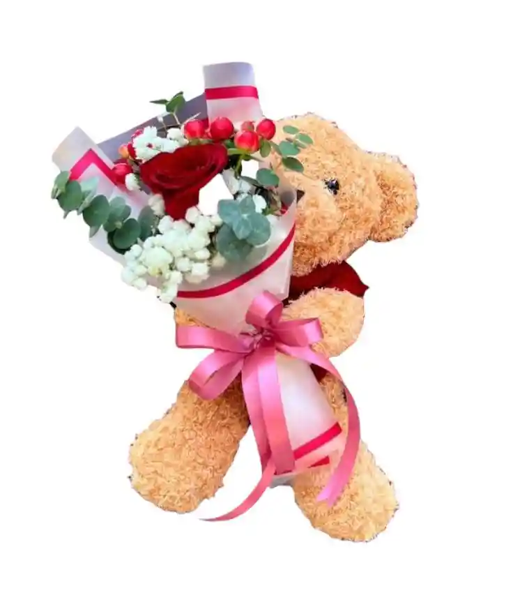 Solitario de 1 rosa roja en papel coreano con peluche pequeño premium