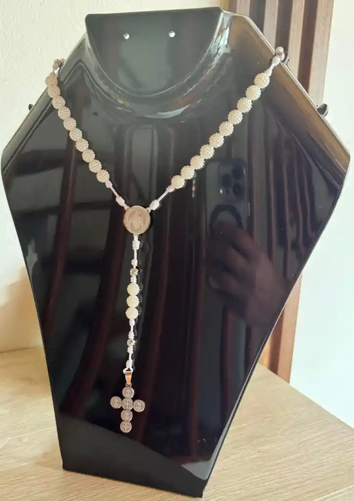 Rosario Mujer Artesanal En Pepa Mora Crema Con Detalles Plateados