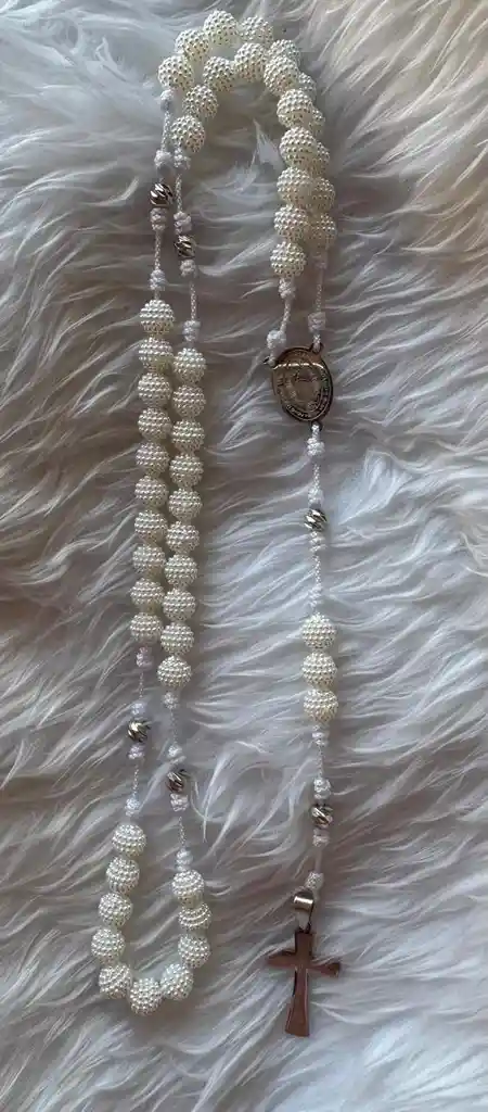 Eleva tus momentos de oración con este hermoso rosario artesanal, elaborado con cuentas en pepa mora de alta calidad que reflejan suavidad, luz y pureza con detalles plateados. Incluye: ✨ Medalla plateada con diseño religioso en acero inoxidable ✨ Misterios distinguidos con perlas de rodio ✨ Cruz dorada especial y distintiva en acero inoxidable ✨ Ensamblado en hilo resistente para mayor durabilidad ✨ Ideal para uso diario, regalos espirituales, bautizos, primeras comuniones y acompañar tus espacios sagrados Su diseño delicado y moderno lo convierte en una pieza significativa, perfecta para quienes buscan un rosario hermoso, resistente y con un acabado premium.